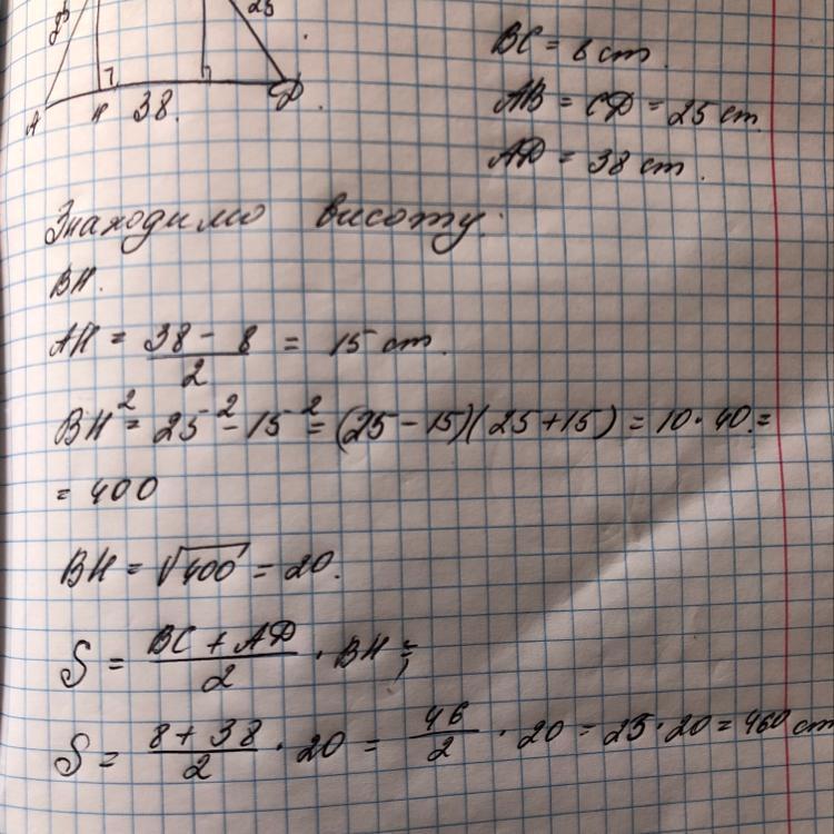 Знайдіть площу рівнобічної трапеції , якщо її основи і бічна сторона відповідно дорівнюють 8 см , 38 час і 25 см. Срочно ! БУДЬ ЛАСКА
