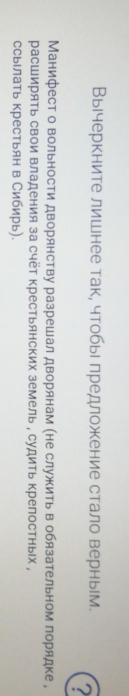 Ответ: Манифест о вольности дворянству разрешал дворянам не служить в обязательном порядке. (Вычеркнуть всё кроме первого)