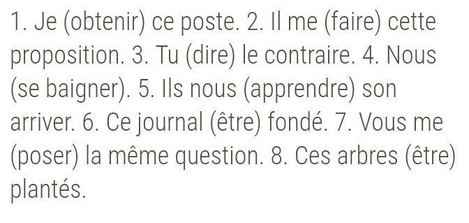 1. Je (obtenir) ce poste. 2. Il me (faire) cette proposition. 3. Tu (dire) le contraire. 4. Nous (se baigner). 5. Ils nous (apprendre) son arriver. 6. Ce journal (être) fondé. 7. Vous me (poser) la même question. 8. Ces arbres (être) plantés.