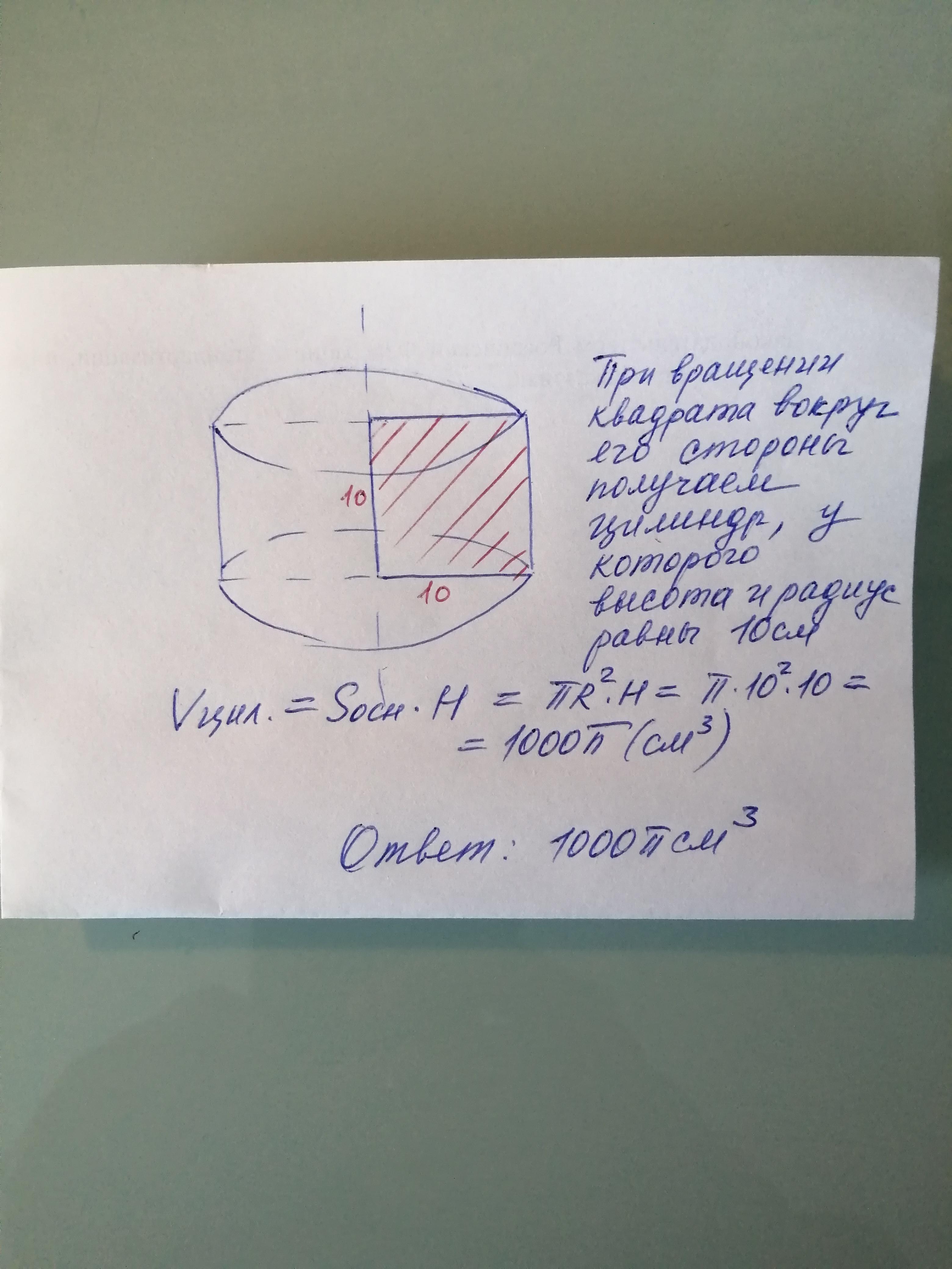 Квадрат вращается вокруг своей стороны, которая равна 10см. Вычисли объём полученного тела вращения.