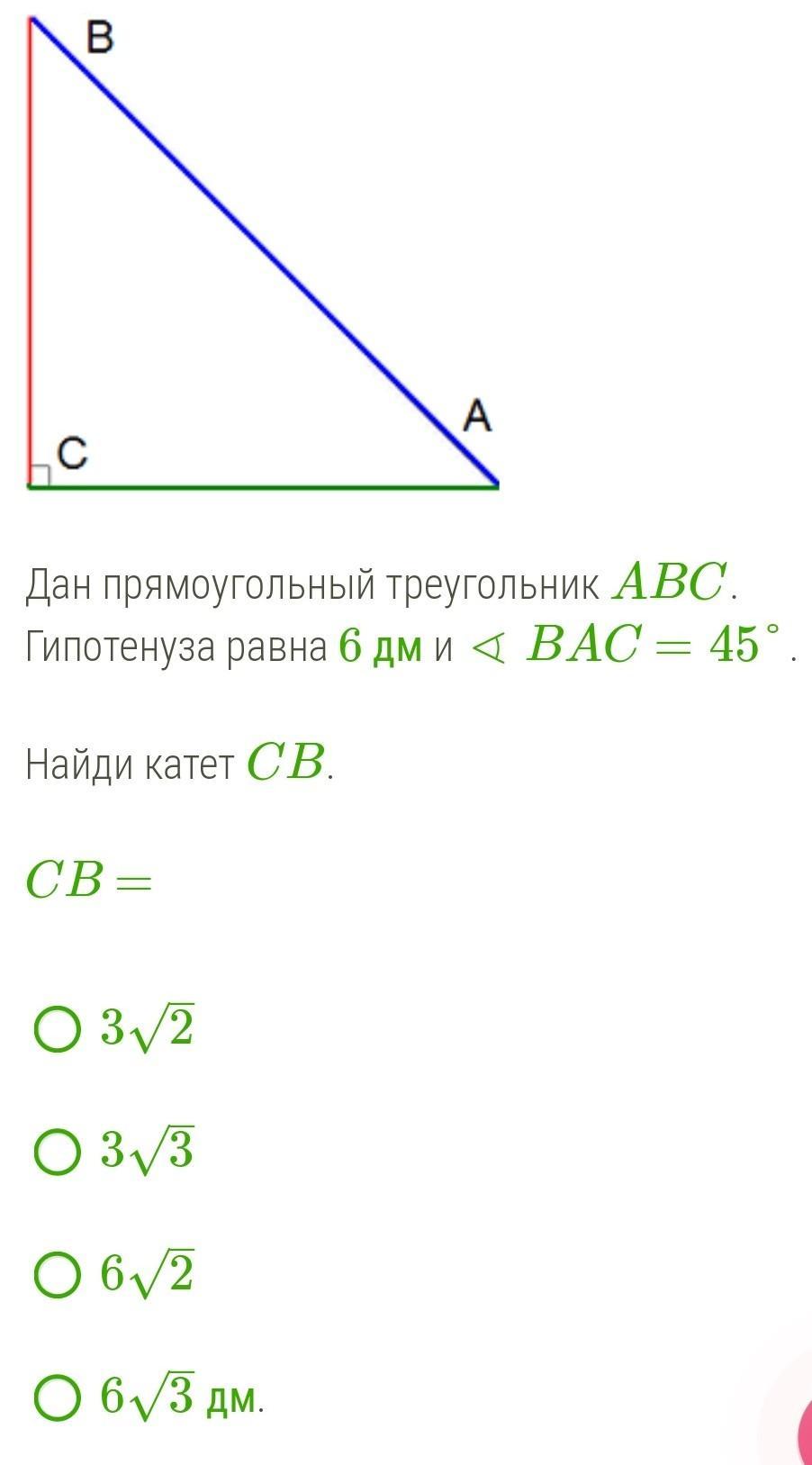 Катет CB= 3√2=4,2