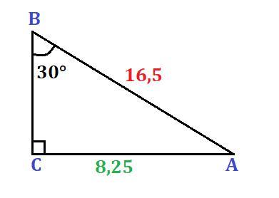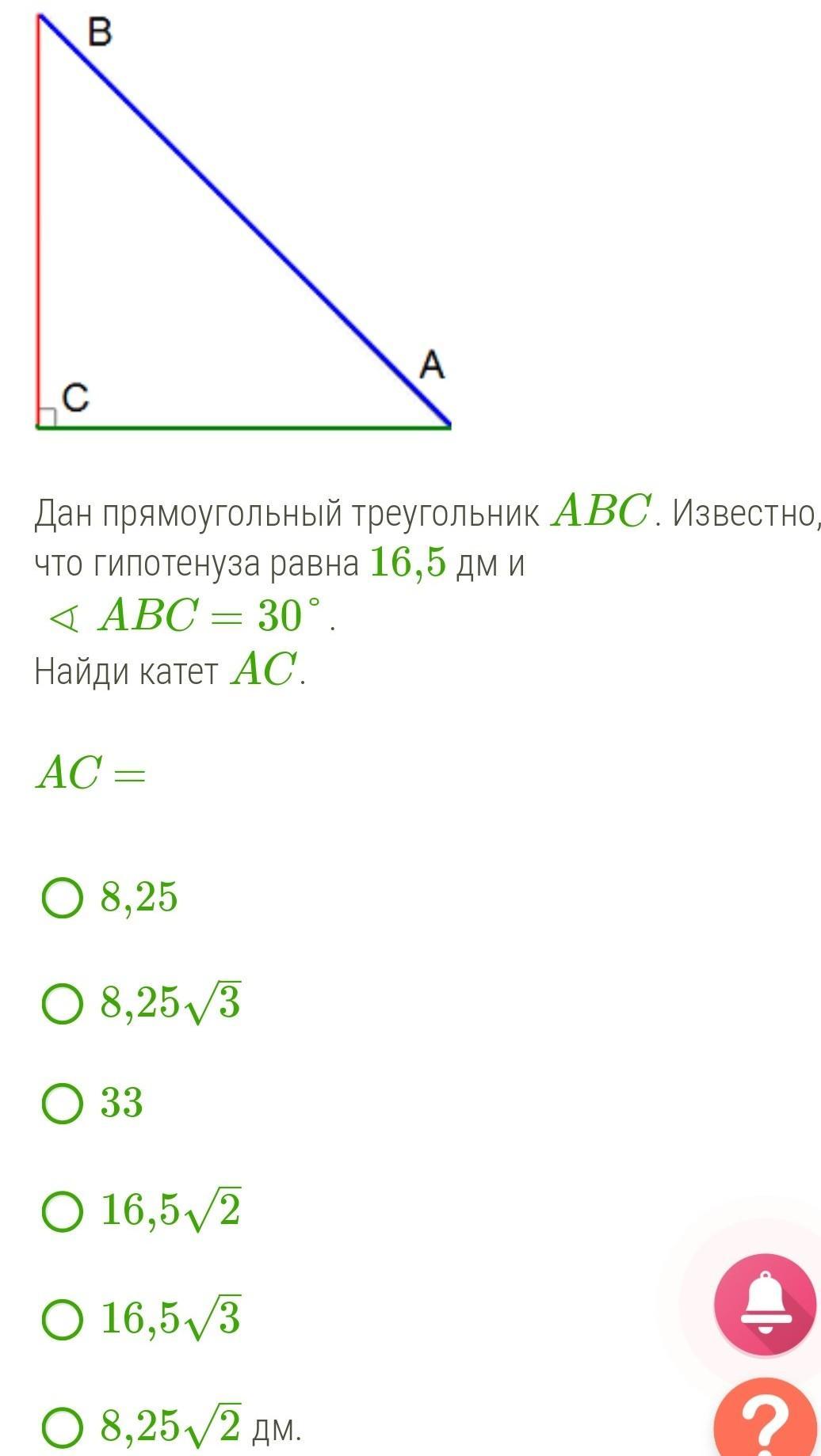 Катет AC тр-ка ABC равен 8,25 (см).