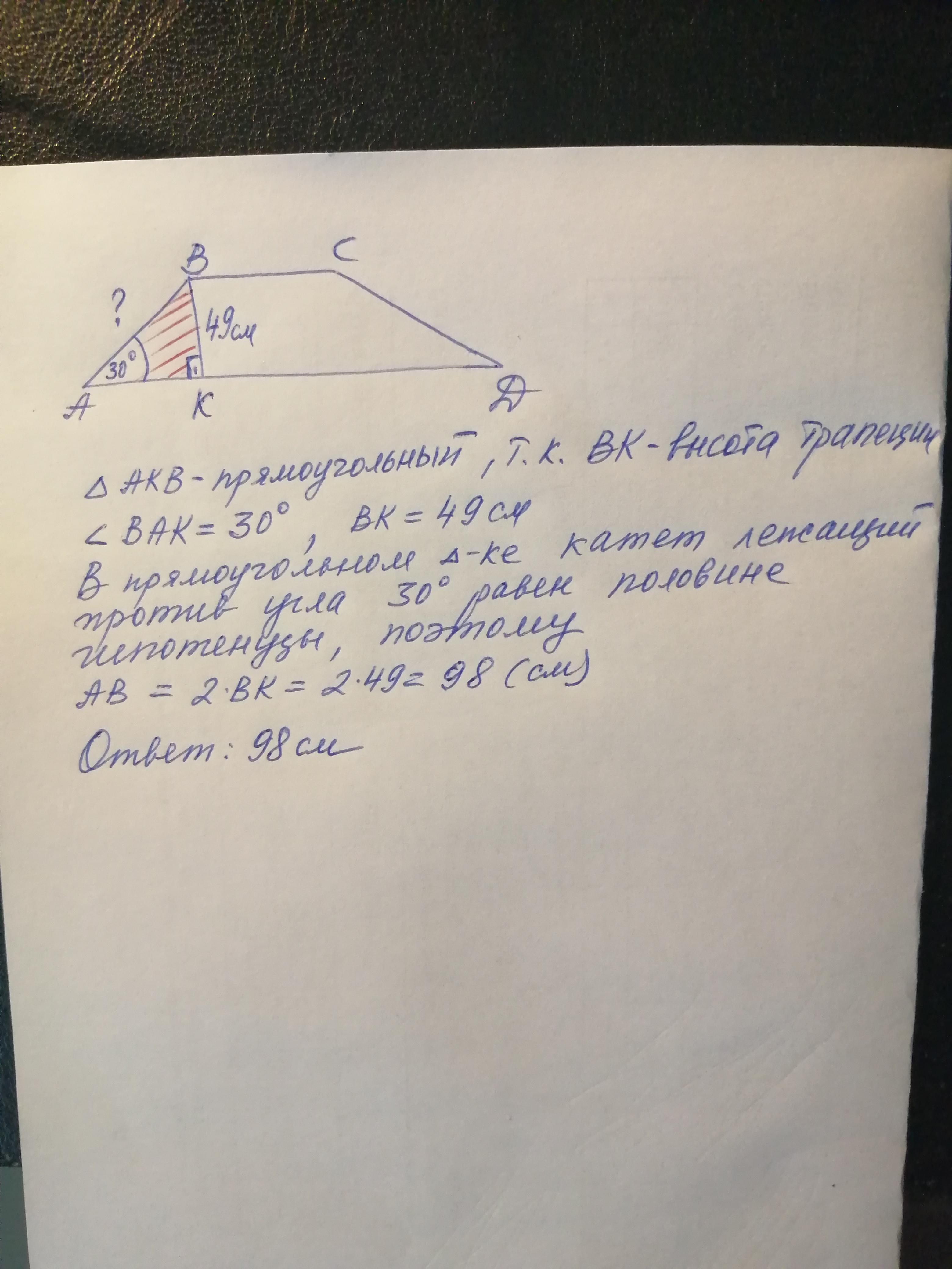 Вычисли сторону AB, если высота BK равна 49 см.