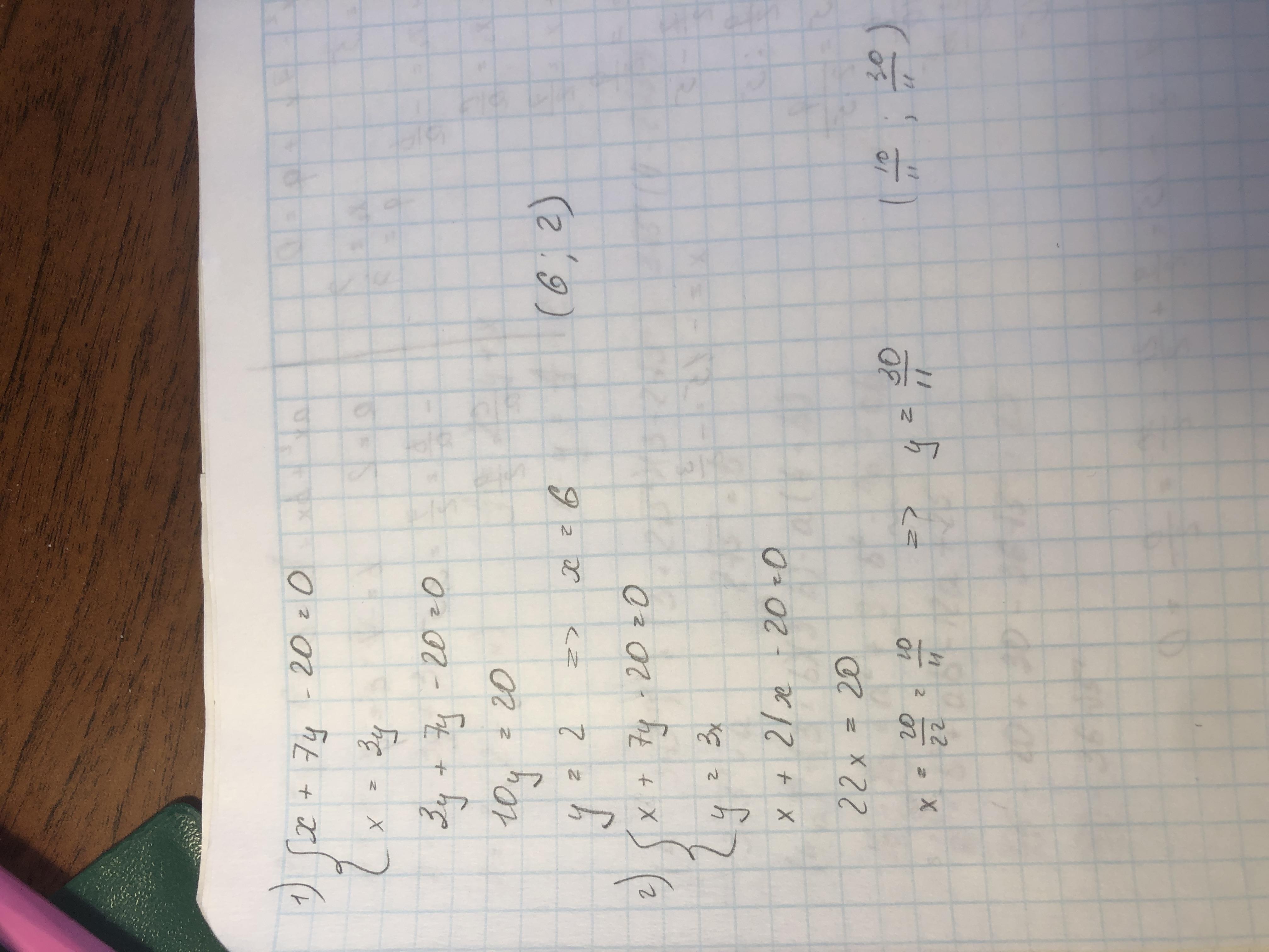 Среди решений уравнения x+7y−20=0 найди такую пару, которая состоит из двух таких чисел, первое из которых в 3 раза больше второго.