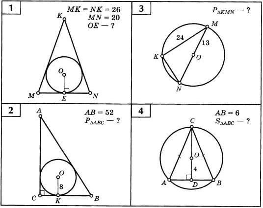 3) OK - радиус вписанной окружности прямоугольного треугольника - находится по формуле , где a,b - катеты, c - гипотенуза.