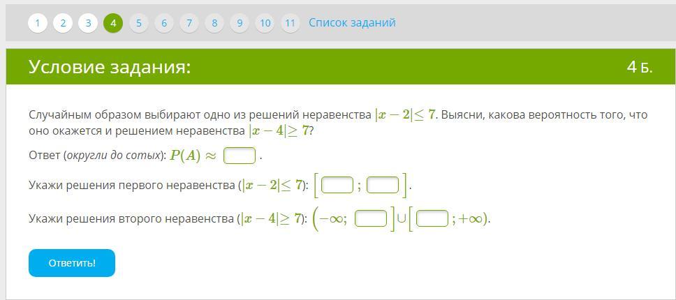 Случайным образом выбирают одно из решений неравенства |x−2|≤7. Выясни, какова вероятность того, что оно окажется и решением неравенства |x−4|≥7?