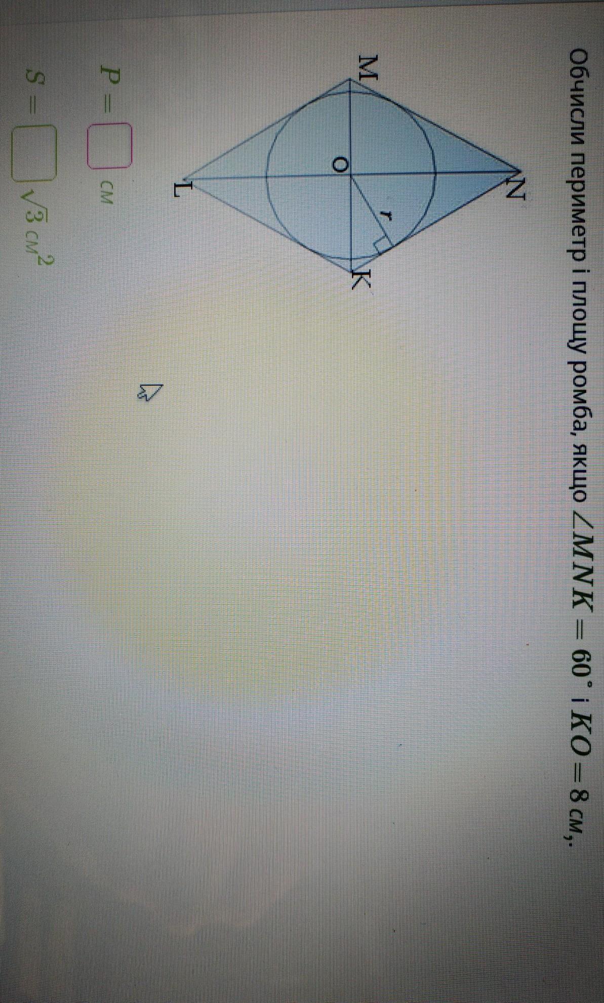 MNKL-ромб, ∠MNK=60°, r⊥NK, КО=8 см.