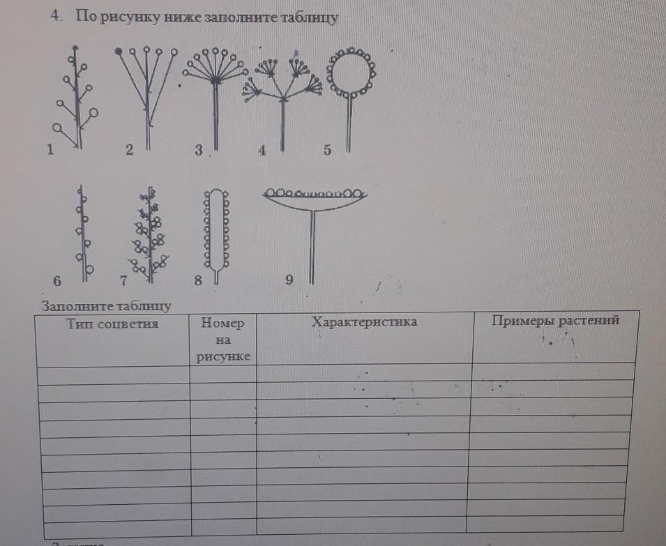 Зонтик, рисунок №3, характеристика: укороченная главная ось, ножки цветов выходят из одной точки, куполообразное расположение цветков, примеры: вишня, лук