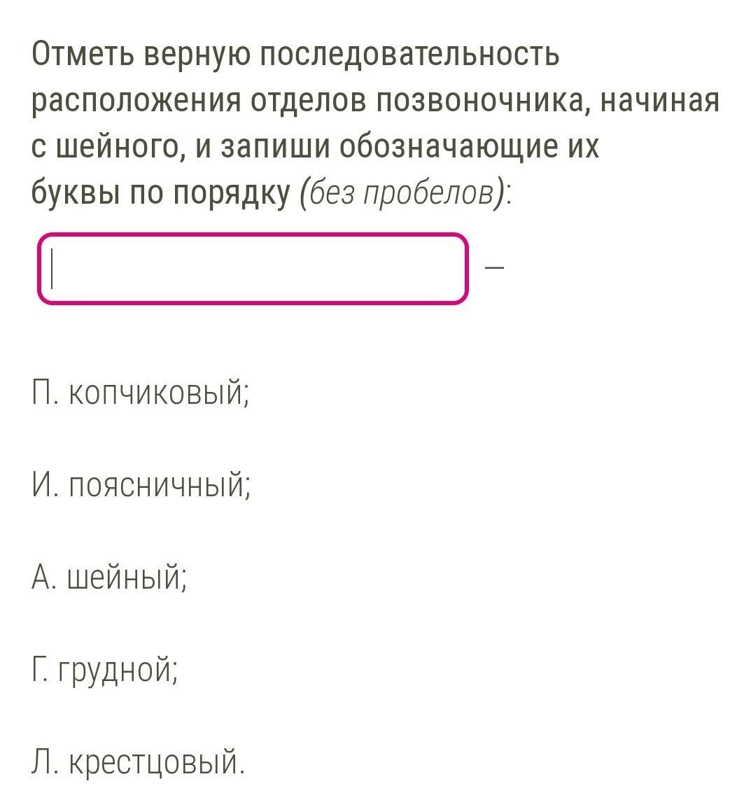 Ответ: А - шейный; Г - грудной; И - поясничный; Л - крестцовый; П - копчиковый