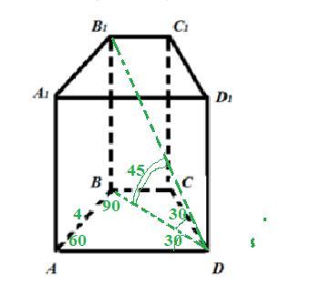 В основе прямой призмы лежит равнобедренная трапеция с острым углом 60 и боковой стороной 4 см. Диагонали трапеции являются биссектрисами острых углов. Диагональ призмы наклонена к плоскости основания под углом 45. Найти объем призмы.