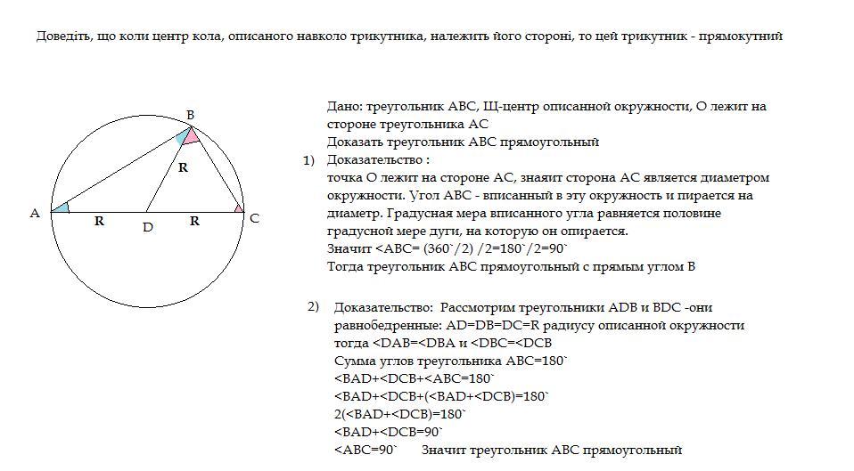 Доведіть, що коли центр кола, описаного навколо трикутника, належить його стороні, то цей трикутник - прямокутний