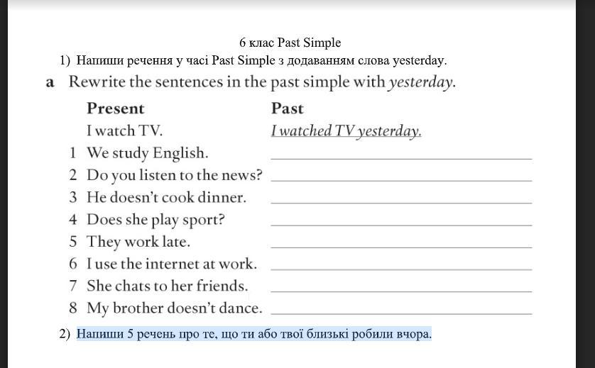 Напиши речення у часi Past Simple з додаванням слова yesterday,Напиши 5 речень про те, що ти або твої близькі робили вчора.