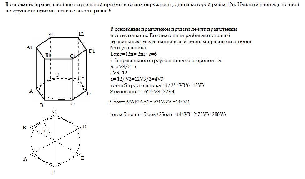 В основание правильной шестиугольной призмы вписана окружность, длина которой равна 12π. Найдите площадь полной поверхности призмы, если ее высота равна 6.