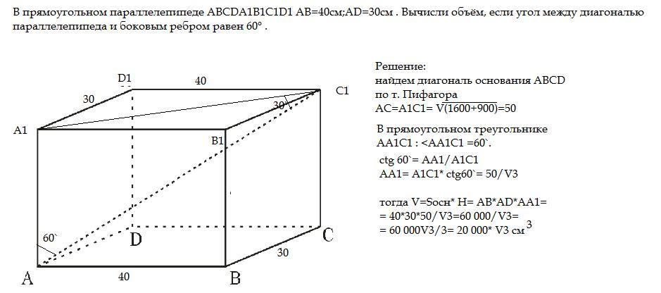 В прямоугольном параллелепипеде ABCDA1B1C1D1 AB=40см;AD=30см . Вычисли объём, если угол между диагональю параллелепипеда и боковым ребром равен 60° .