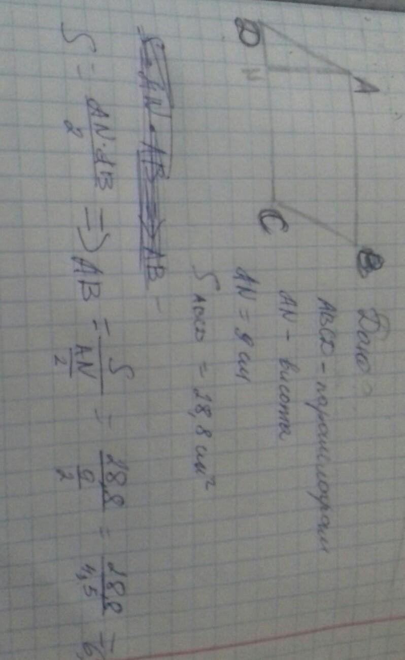 висота паралелограма 9 см знайти сторону до якої вона проведена якщо площа паралелограма дорівнює 28,8 см в квадраті?????
