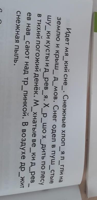Идёт мягкий снег. Снежные хлопья легли на землю и крыши домов. Снег одел в пушистые шубки кусты и деревья. Хорошо ходить по лесу в тихий погожий денёк. Мохнатые ветки деревьев нависают над тропинкой. В воздухе дрожит снежная пыль.