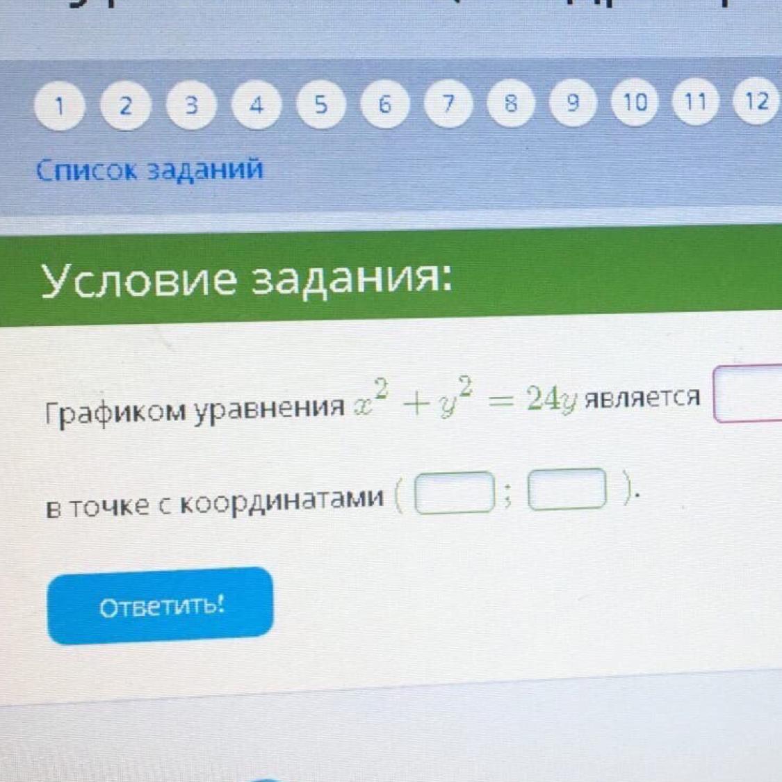 х²+(у-12)²=144 - это уравнение является уравнением окружности с центром в точке (0;12) и радиусом, равным 12.