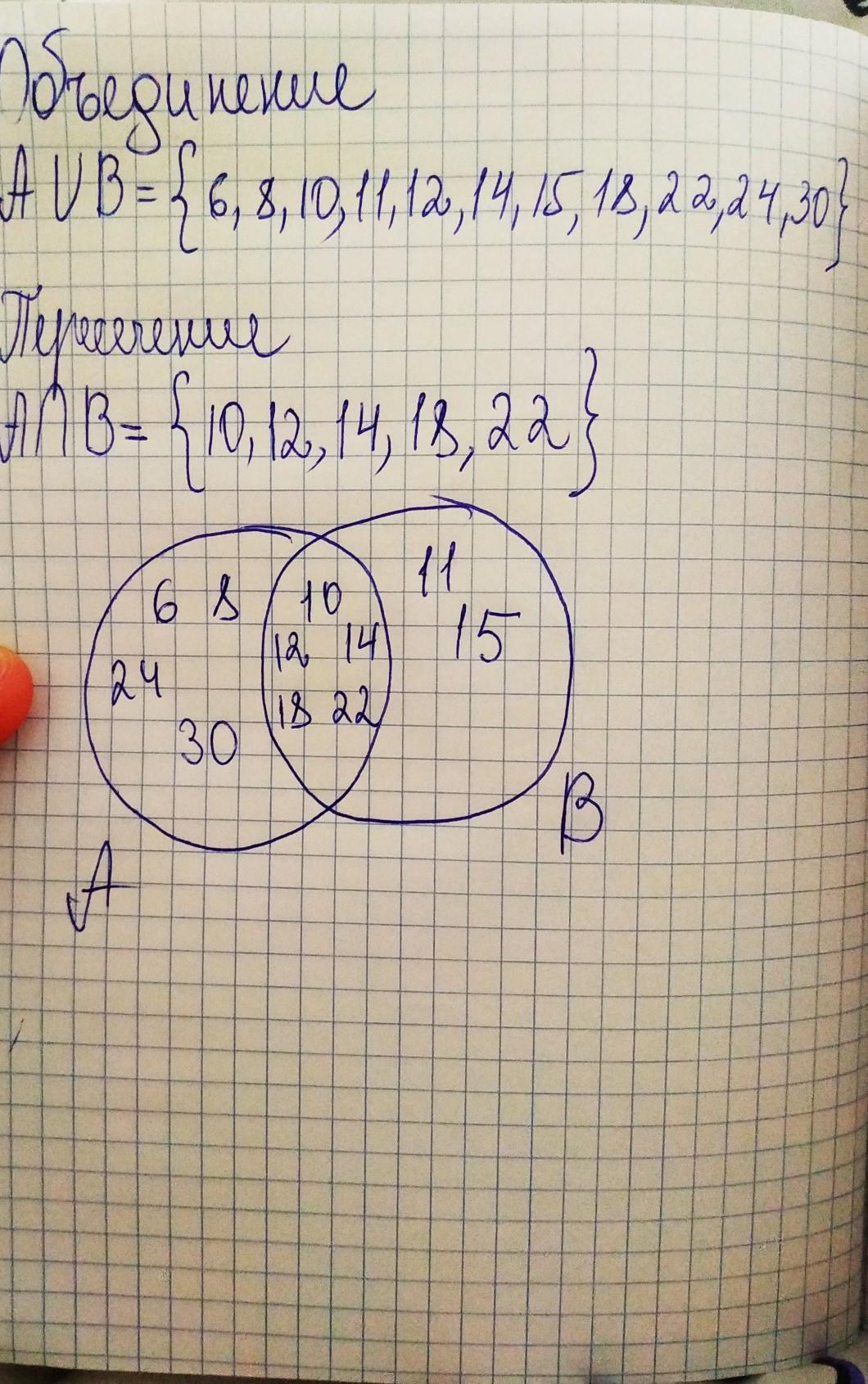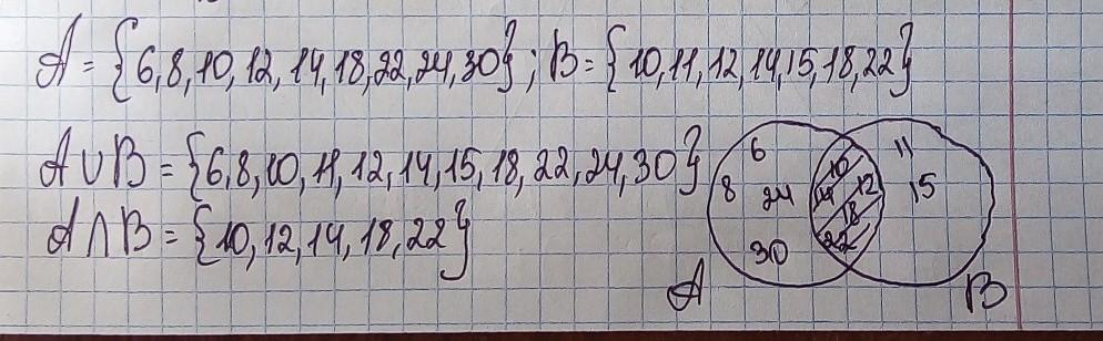 Даны множеста. А={6,8,10,12,14,18,22,24,30}и В={10,11,12,14,15,18,22} найти объединение пересечений множеств, выполнить диограмму Эйлера Венна.