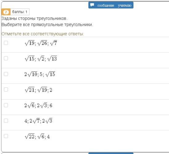 √19²+√7²=26 и √26²=26⇒прямоугольный;