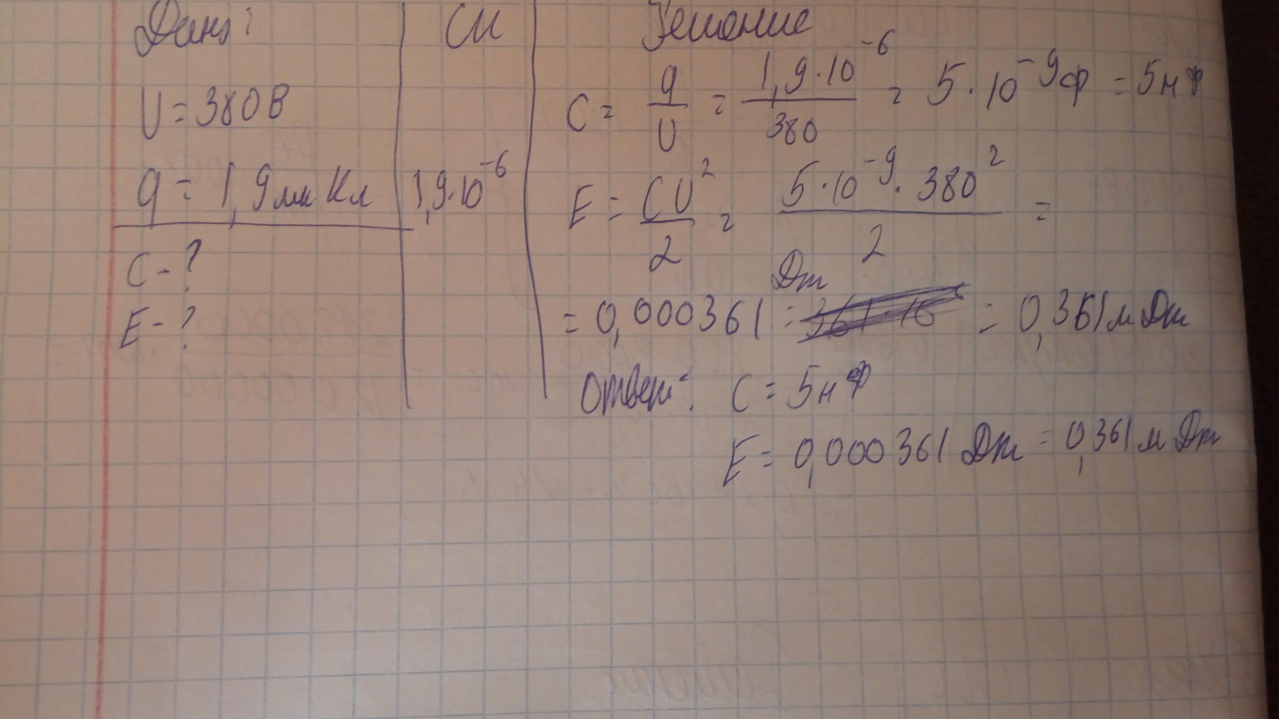 Плоский конденсатор подсоединяется к источнику напряжения в 380 В. На его пластинах накапливается заряд 1,9 мкКл. Определите емкость конденсатора и накопленную им энергию.