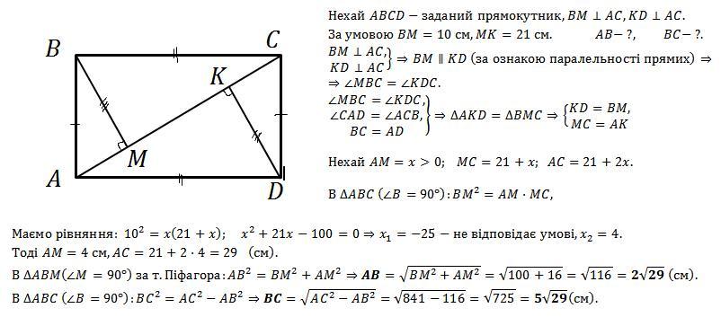 У прямокутнику АВСD до діагоналі АС проведено перпендикуляри ВМ і DK. Відомо, що ВМ=10см, МК= 21 см. Знайдіть сторони прямокутника
