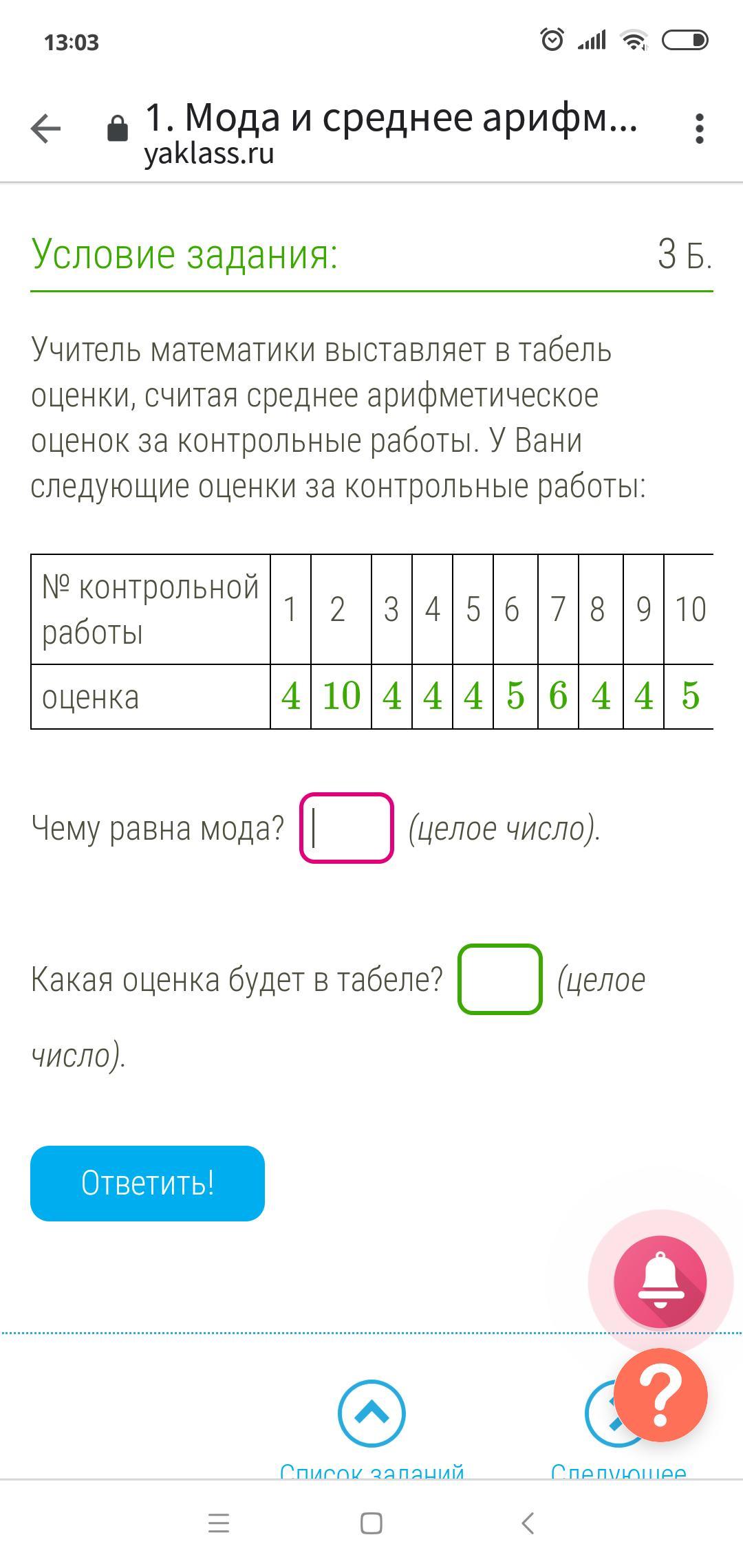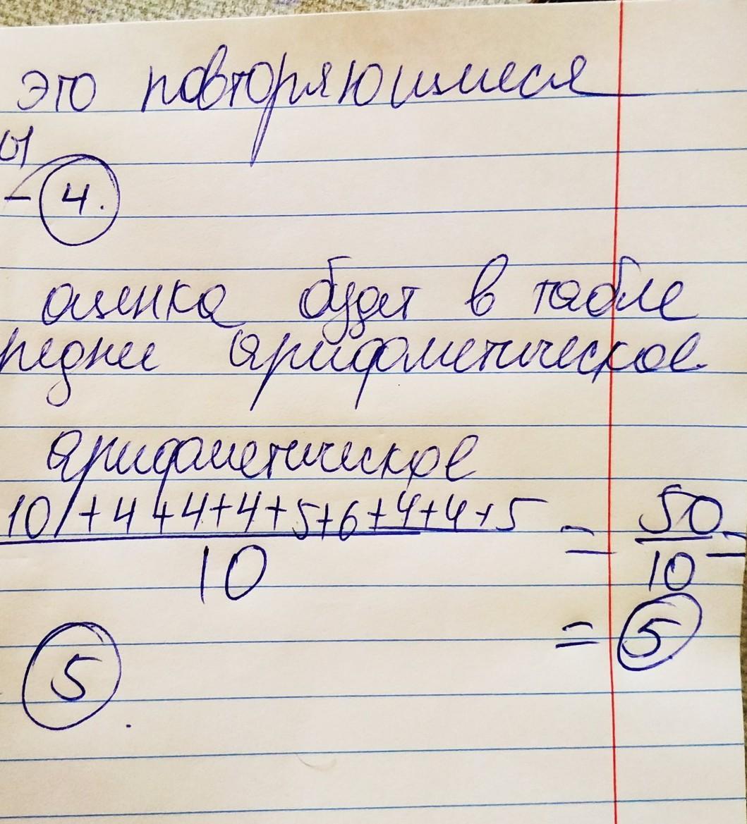 В табеле средняя оценка: (4+10+4+4+4+5+6+4+4+5)/10 = 50/10 = 5
