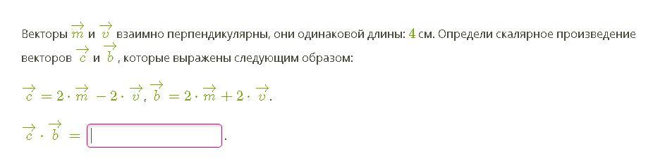 Векторы m→ и v→ взаимно перпендикулярны, они одинаковой длины: 4 см. Определи скалярное произведение векторов c→ и b→, которые выражены следующим образом: