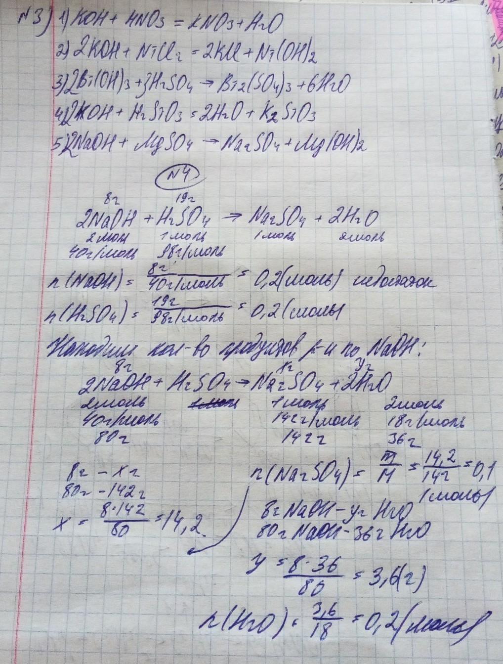 1какие соединения называются основаниями?2объясните на примерах реакцию нейтрализации.3напишите уравнения реакций между следующими соединениями:1)гидроксид калия+азотная кислота;2)гидроксид калия+хлорид никеля(||);3)тригидроксид висмута+серная кислота;4)гидроксид калия+кремниевая кислота;5)гидроксид натрия+сульфат магния.4Какое количество продуктов образуется при реакции между 8г гидроксида натрия и 19г серной кислоты? ПОЖАЛУЙСТА СРОЧНО ПОМОГИТЕ, ДАМ СКОЛЬКО ЗАХОТИТЕ БАЛЛОВ