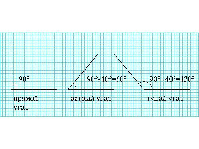 начертите три угла первый равный 90 градусов, второй меньше первого на 40 градусов, а третий на 40 градусов больше первого. запишите вид каждого угла.