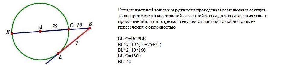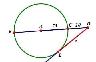 Расстояние от А до L это перпендикуляр, значит AL=R=AC=AK=75, тогда ∆ABL прямоугольный, где AL=75, AB=75+10=85, по теореме Пифагора