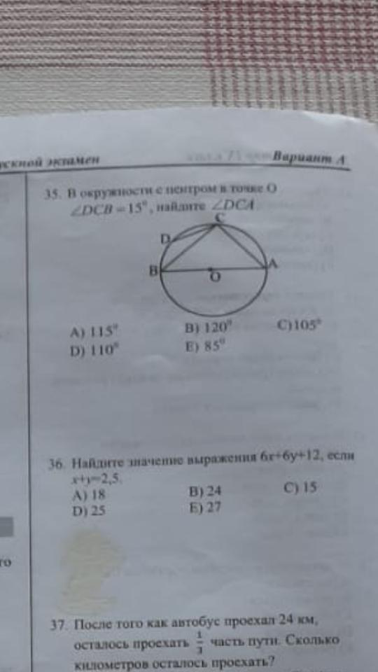 ∠ВСА опирается на диаметр, следовательно ∠ВСА=90°. Тогда ∠DCA=∠DCB+∠BCA=15°+90°=105°.