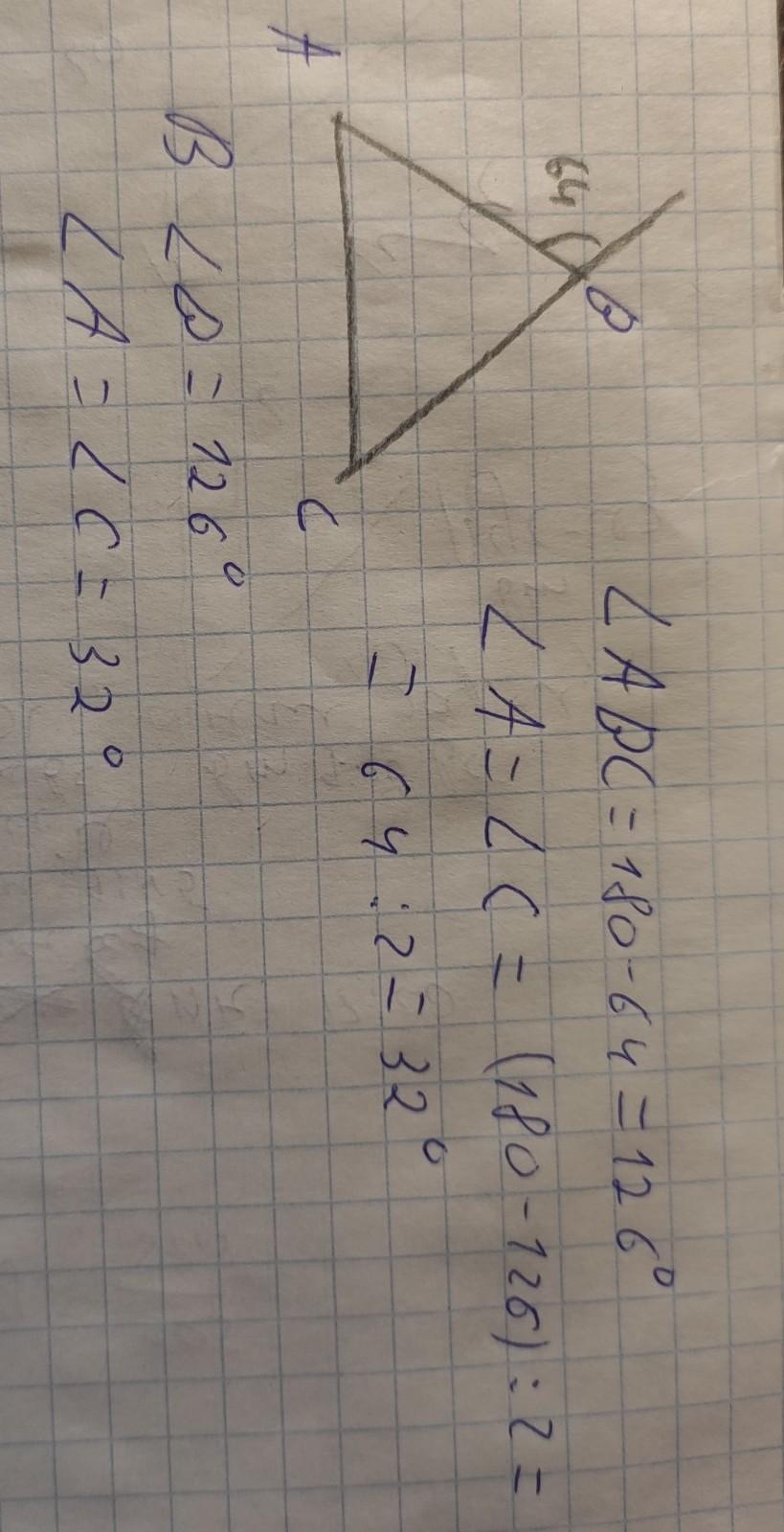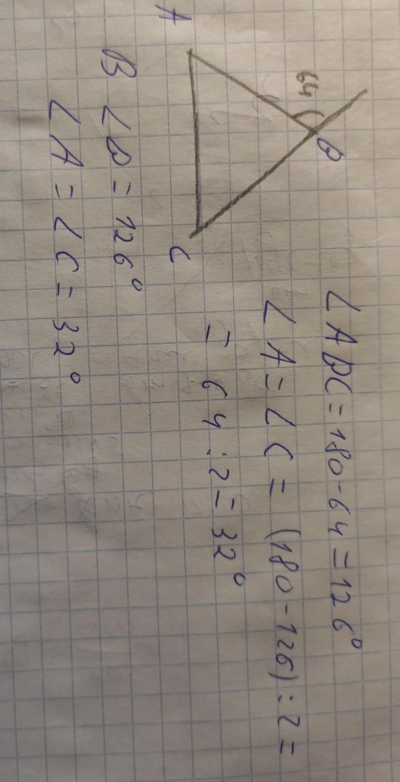 Зовнішній кут при вершині рівнобедреного трикутника дорівнює 64* . Знайдіть внутрішні кути трикутника
