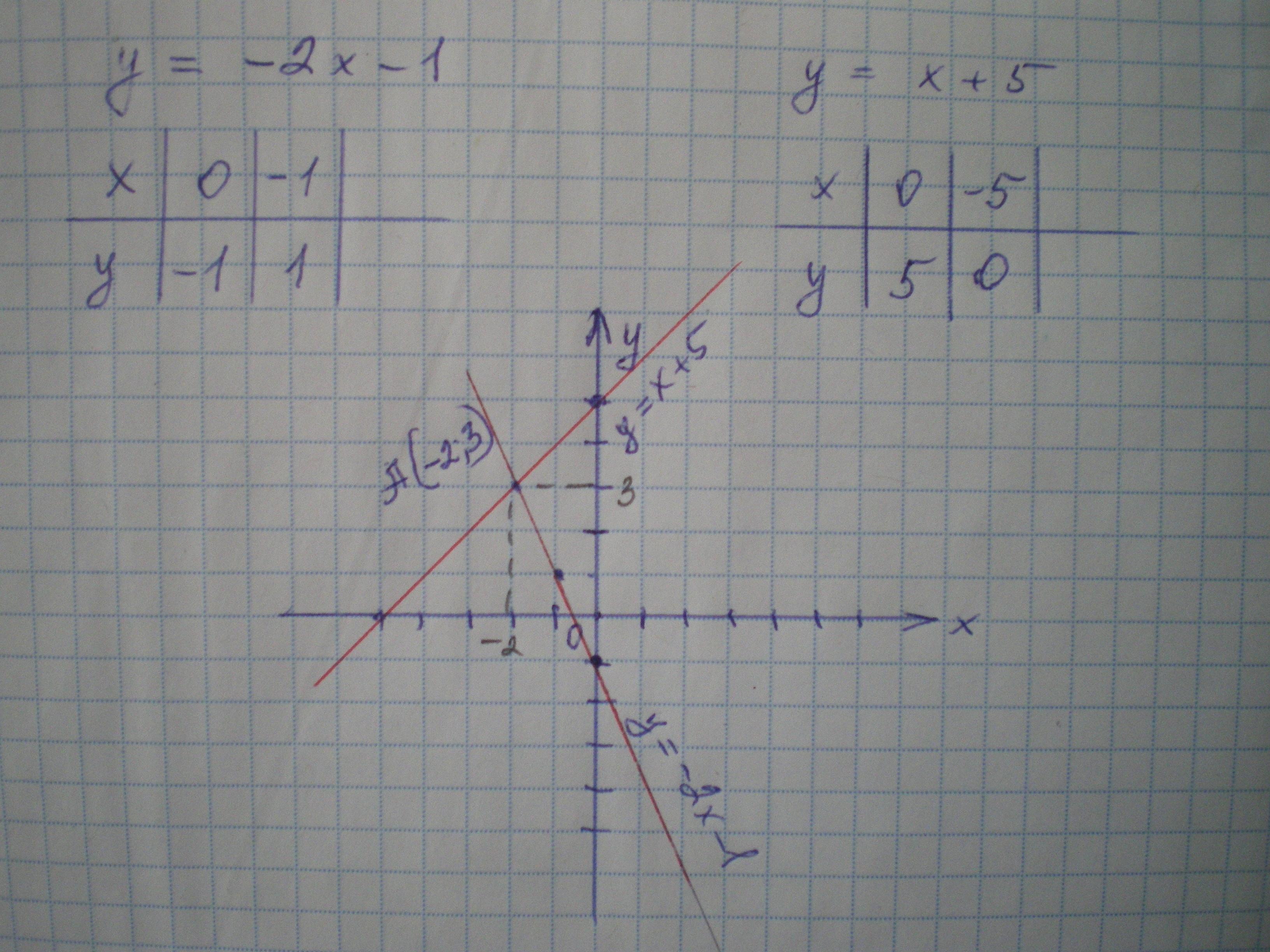 Побудуйте в одній системі координат графіки функцій y = –2x – 1 та y = x + 5 і вкажіть координати точки їх перетину.