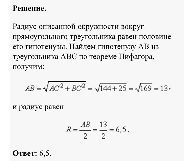 треугольнике ABC известно, что АС =12, ВС = 5, угол С равен 90°. Найдите радиус описанной около этого треугольника окружности.