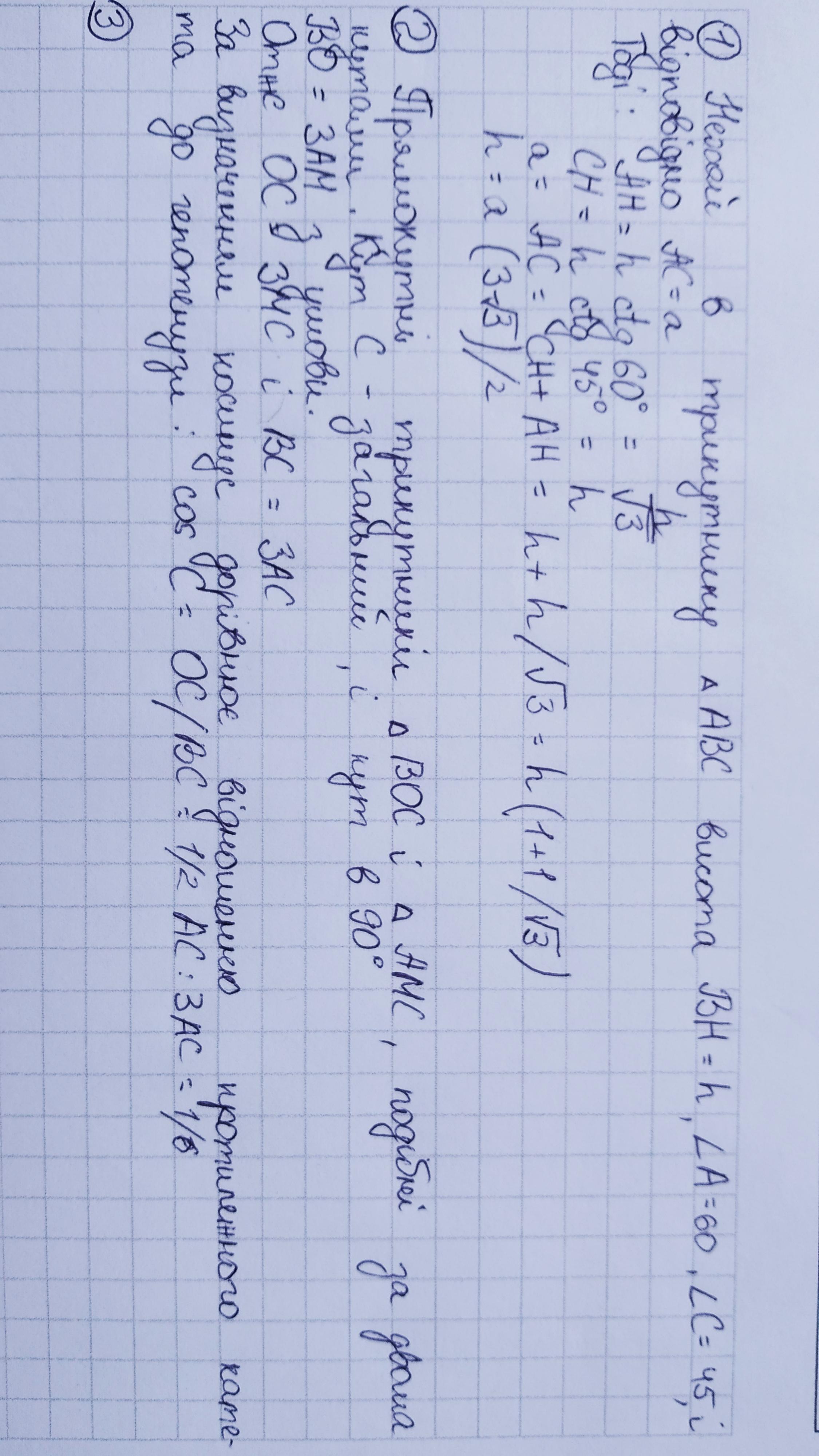 1) Одна із сторін трикутника дорівнює а, прилеглі до неї кути дорівнюють 45о і 60о. Знайдіть висоту трикутника, проведену до даної сторони.