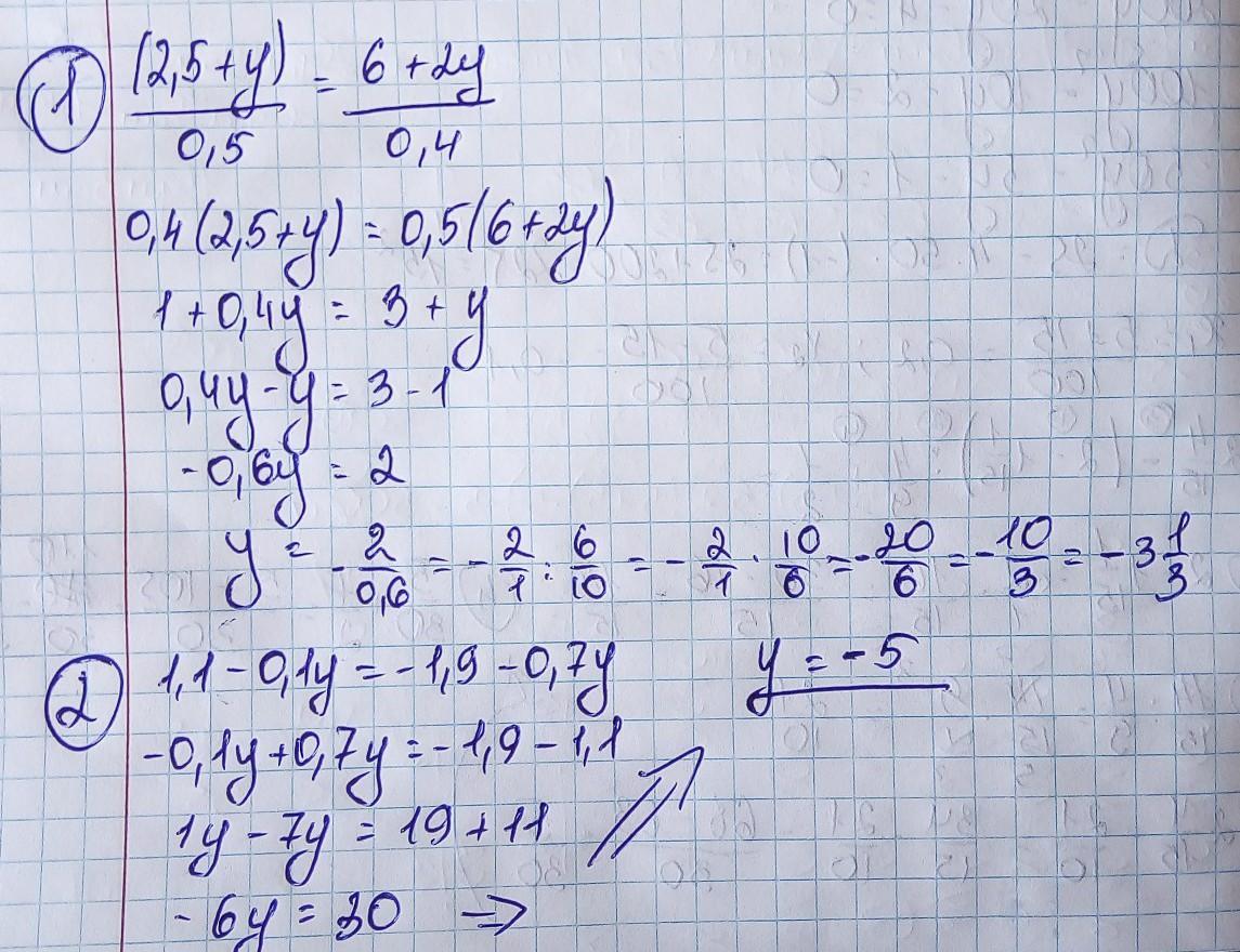 Найдите корень уравнения : (2,5+у)/0,5=(6+2у)/0,4 ; 1,1-0,1у=-1,9-0,7у