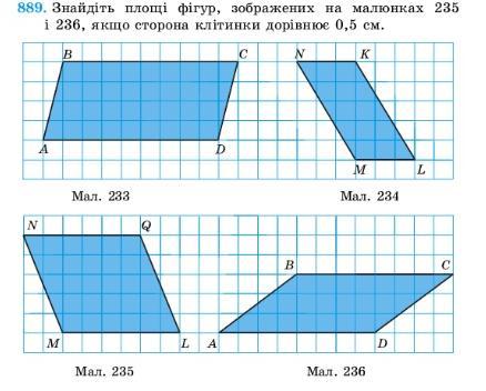 Найти площади фигур, изображённых на рисунках 235 и 236, если сторона клетки равна 0,5 см.