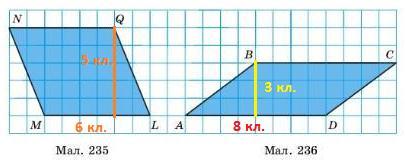 Рис. 235. На рисунке параллелограмм, сторона которого равна 6 кл., а высота, проведённая к этой стороне, равна 5 кл.