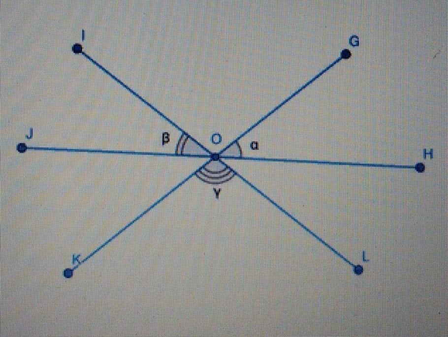 На рисунке изображены три прямые, пересекающиеся в точке O. Найдите сумму углов a+b+y.