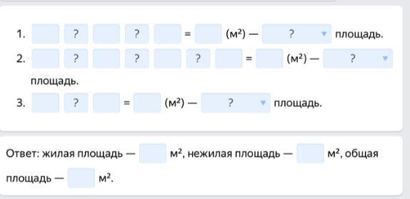 В квартире три комнаты, кухня, прихожая, туалет и кладовая. Размеры всех помещений отмечены на плане квартиры. Найди жилую, нежилую и общую площадь этой квартиры.