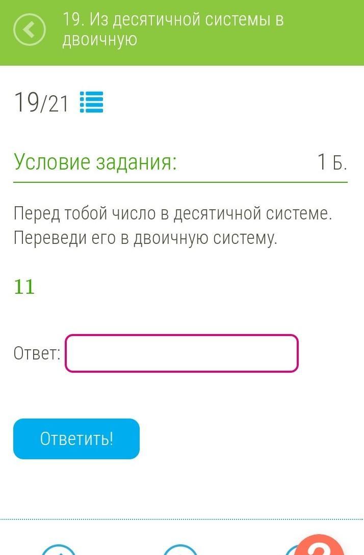 Перед тобой число в десятичной системе. Переведи его в двоичную систему.