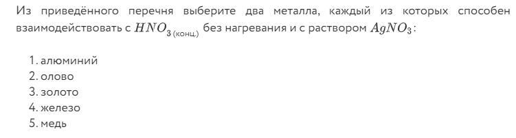 Из приведённого перечня выберите два металла, каждый из которых способен взаимодействовать с HNO3 (конц) без нагревания с раствором AgNO3
