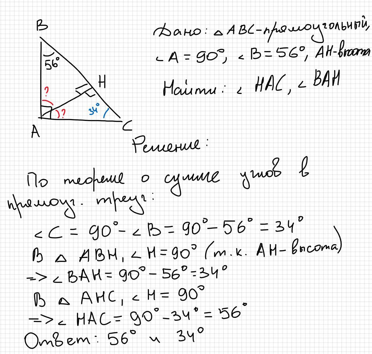 Какие углы эта высота образует с катетами,если больший из острых углов этого треугольника равен 56°?