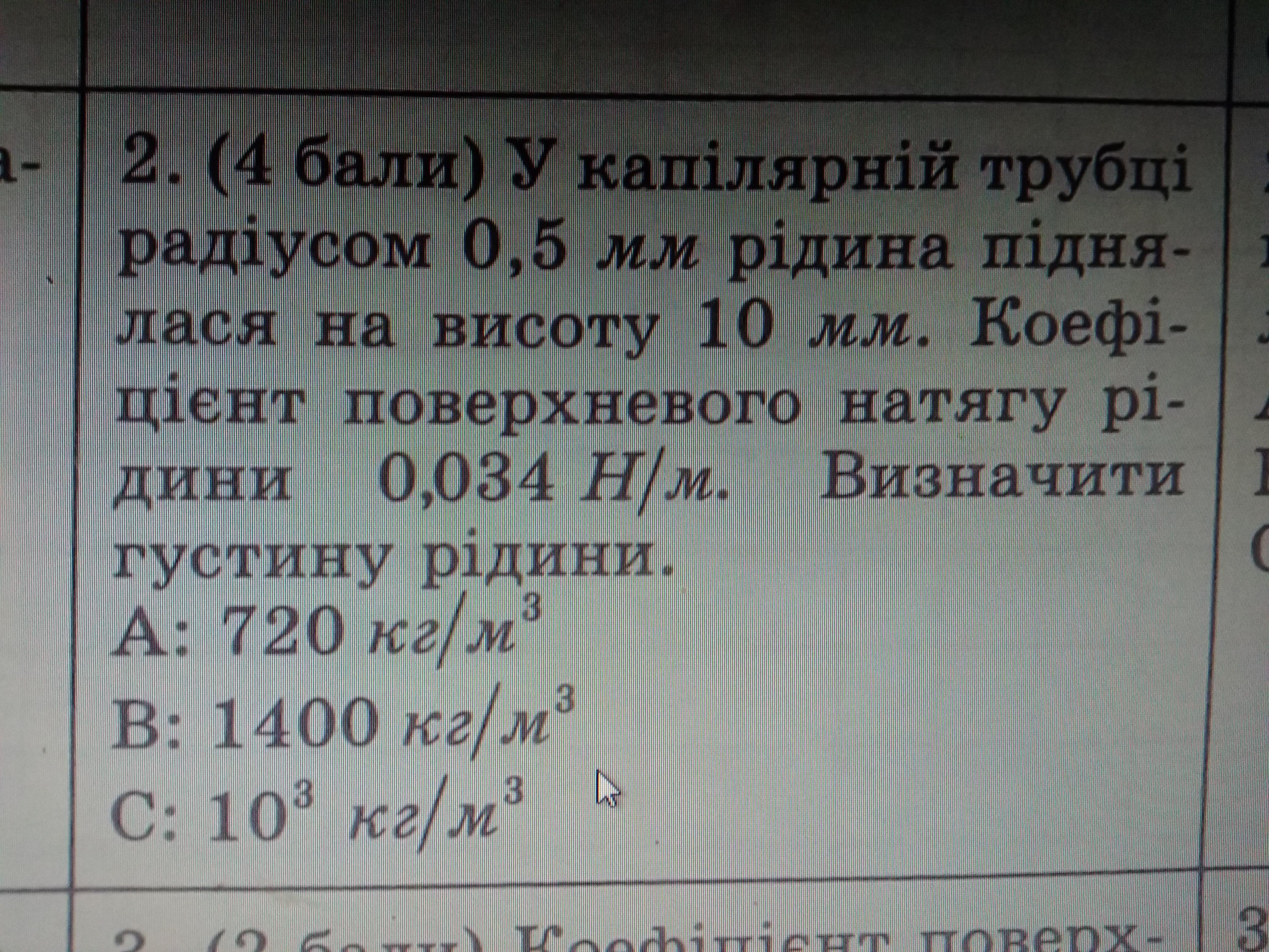 У капілярній трубці радіусом 0,5 мм рідина піднялася на висоту 10 мм . Коефіцієнт поверхневого натягу рідини 0.034 H/м. визначити густину рідини .
