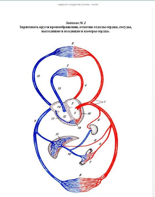 Первый вопрос: Зарисовать круги кровообращения, отметив отделы сердца, сосуды выходящие и входящие в камеры сердца.