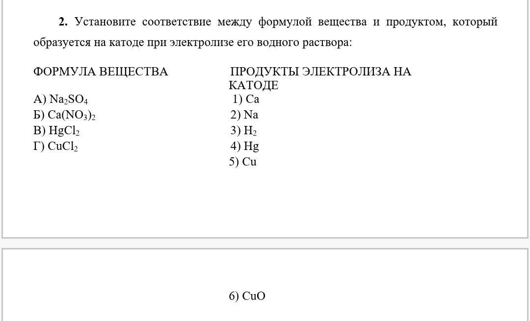 2. Установите соответствие между формулой вещества и продуктом, который образуется на катоде при электролизе его водного раствора: