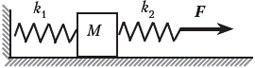 К системе из кубика массой 1 кг и двух пружин приложена постоянная горизонтальная сила F (см. рисунок). Между кубиком и опорой трения нет. Система покоится. Левый край первой пружины прикреплён к стенке. Удлинение первой пружины равно 2 см. Вто-рая пружина растянута на 3 см. Жёсткость первой пружины k1=600 Н/м. Жёсткость вто-рой пружины равна