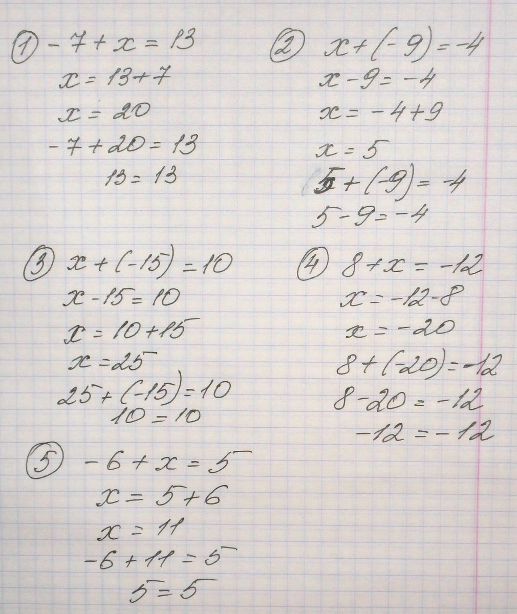 -7+х=13 х+(-9) = -4 х+(-15)= 10 8+х = - 12 -6+х = 5 х+(-14)=- 8