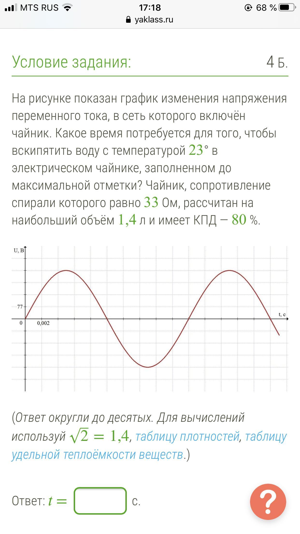 На рисунке показан график изменения напряжения переменного тока, в сеть которого включён чайник. Какое время потребуется для того, чтобы вскипятить воду с температурой 23° в электрическом чайнике, заполненном до максимальной отметки? Чайник, сопротивление спирали которого равно 33 Ом, рассчитан на наибольший объём 1,4 л и имеет КПД — 80 %.