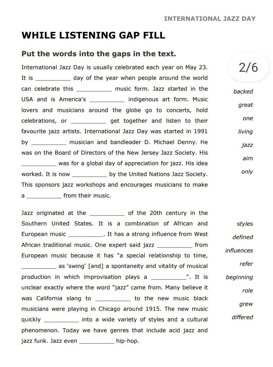 International Jazz Day is usually celebrated each year on May 23. It is one day of the year when people around the world can celebrate this great music form. Jazz started in the USA and is America's only indigenous art form. Music lovers and musicians around the globe go to concerts, hold celebrations, or simply get together and listen to their favourite jazz artists. International Jazz Day was started in 1991 by jazz musician and bandleader D. Michael Denny. He was on the Board of Directors of the New Jersey Jazz Society. His aim was for a global day of appreciation for jazz. His idea worked. It is now backed by the United Nations Jazz Society. This sponsors jazz workshops and encourages musicians to make a living from their music.